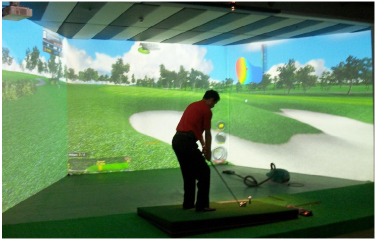 “鳴時(shí)達(dá)”公司的“模擬高爾夫”是在高爾夫球基礎(chǔ)上,利用計(jì)算機(jī)情景模擬技術(shù)將室外真實(shí)的高爾夫球場(chǎng)模擬設(shè)計(jì)到一套軟件系統(tǒng)中,通過(guò)投影機(jī)投影展現(xiàn)在球手面前的幕布上,同時(shí)通過(guò)傳感器對(duì)球手擊出的球的飛行數(shù)據(jù)進(jìn)行采集分析,模擬出與真實(shí)球場(chǎng)一樣的視覺(jué)感觀,球的飛行高度、角度、距離、彈跳等都仿佛置身于真實(shí)的球場(chǎng)環(huán)境。