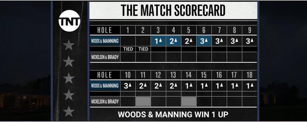 比賽因為下雨推遲了一個小時才開打,前9洞采用四人四球賽形式,在現場主持人Samuel L. Jackson的介紹之后,曼寧和布雷迪的開球紛紛失誤,老米同樣錯失了球道,伍茲上了球道但是沒有把球送上果嶺的右側。前2個洞雙方都沒有下分,554碼的3號洞,伍茲開球成功上球道,為他的慈善基金會賺得了150萬美元的獎金,布雷迪和曼寧的開球都再度進入了樹叢,不得不重新開球,再度出局。伍茲的發揮很穩健,他的第二桿貫穿球道,成功抓下了小鳥球,老米則錯過了保帕推,伍茲/曼寧以1洞領先。