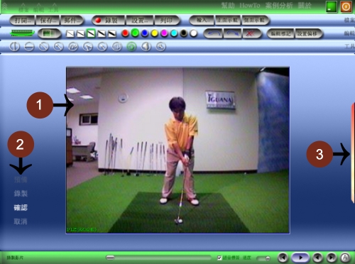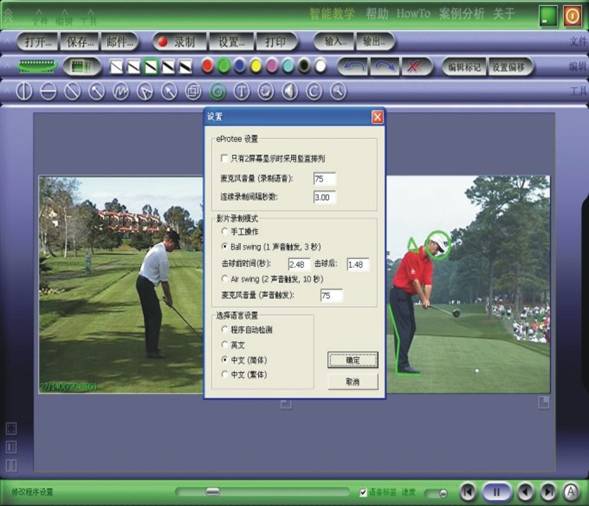 支持三種語言,可自由切換簡\繁\英等三種語言.支持聲控自動錄制。當擊球前的2.48秒和擊球后的1.48秒系統會自動錄制,然后自動播放一次后又自動進行錄制!整個過程由擊球場自動控制,使用非常方便。同時它還支持手動錄制,結合DV還可實現離線拍攝功能。先用DV將教練打球的動作錄制下來,回家后打開DV將其調成播放狀態,在DV的顯視屏可以看到打球動作。然后打開高爾夫軟件就可以看到影像跟DV的同步播放。只需要在擊球前按錄制,收桿后按完成即可轉換成swing格試的文件。